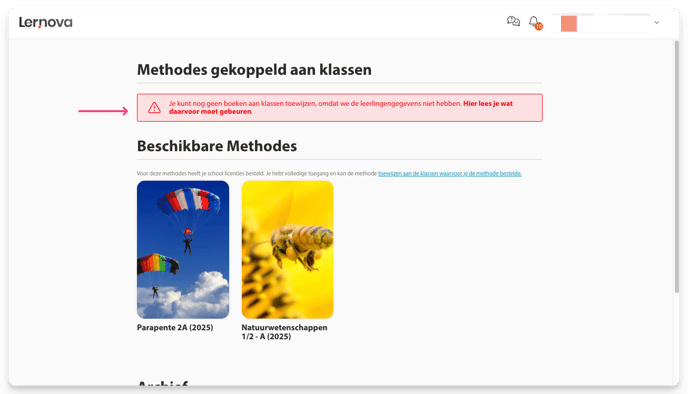 Zie je de melding "Je kunt nog geen boeken aan klassen toewijzen, omdat we de leerlingengegevens niet hebben." op het startscherm, dan moet je school de gegevens voor synchronisatie met Smartschool bezorgen of een spreadsheet met leelingengegevens.